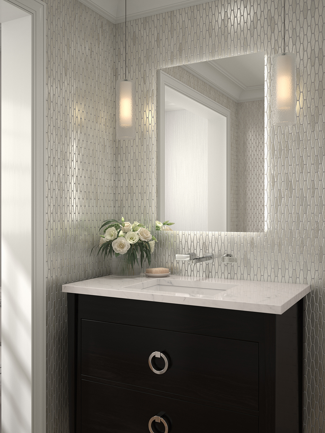 Get creative with how you place that linear mosaic. No rule says it has to go in a horizontal direction. Like the subways above, flip it to a vertical position for a sleek look. Stakes Sepia from the Glassique Collection is turned on its side, adding height to this powder room wall.
